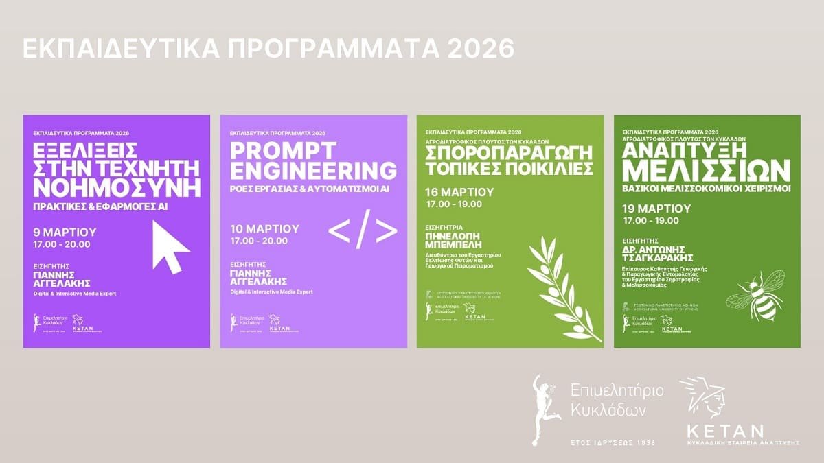 Το Επιμελητήριο Κυκλάδων διοργανώνει από 9 έως 19 Μαρτίου 2026 τέσσερα δωρεάν υβριδικά σεμινάρια (με δυνατότητα διαδικτυακής και δια ζώσης συμμετοχής), απευθυνόμενα σε επιχειρήσεις, εργαζομένους και παραγωγούς των Κυκλάδων. Ο νέος κύκλος καλύπτει σύγχρονες θεματικές στην Τεχνητή Νοημοσύνη και την επιχειρηματικότητα, καθώς και την ανάδειξη και αξιοποίηση του αγροδιατροφικού πλούτου των νησιών, με στόχο την ενίσχυση των παραγωγικών δυνάμεων του πρωτογενούς τομέα και τη συνεχή επιμόρφωση των μελών του.