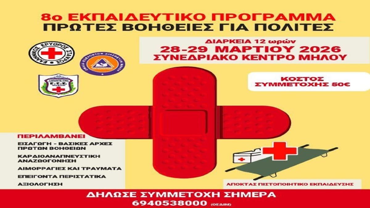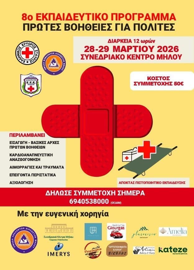 Την διοργάνωση του 8ου Εκπαιδευτικού Προγράμματος Πρώτων Βοηθειών για πολίτες διοργανώνει η Ομάδα Εθελοντών Διασωστών Μήλου (Ο.Ε.Δι.Μ.), το οποίο θα πραγματοποιηθεί το διήμερο 28 και 29 Μαρτίου 2026 στο Συνεδριακό Κέντρο Μήλου.