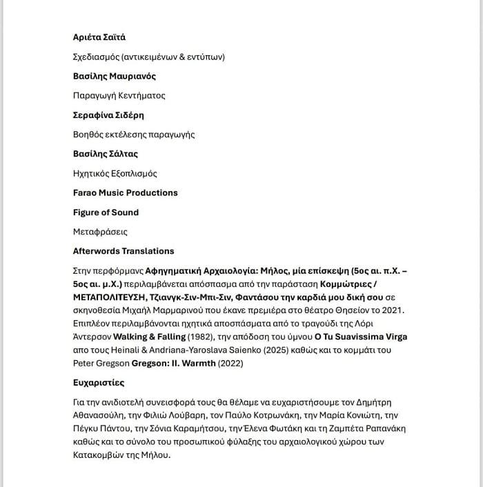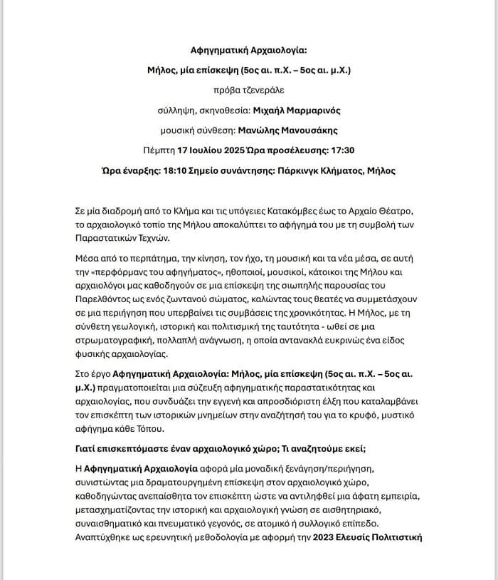 Από το Κλήμα έως το Αρχαίο Θέατρο, η Μήλος αποκαλύπτεται μέσα από τον λόγο, την κίνηση και την τέχνη της μνήμης.
