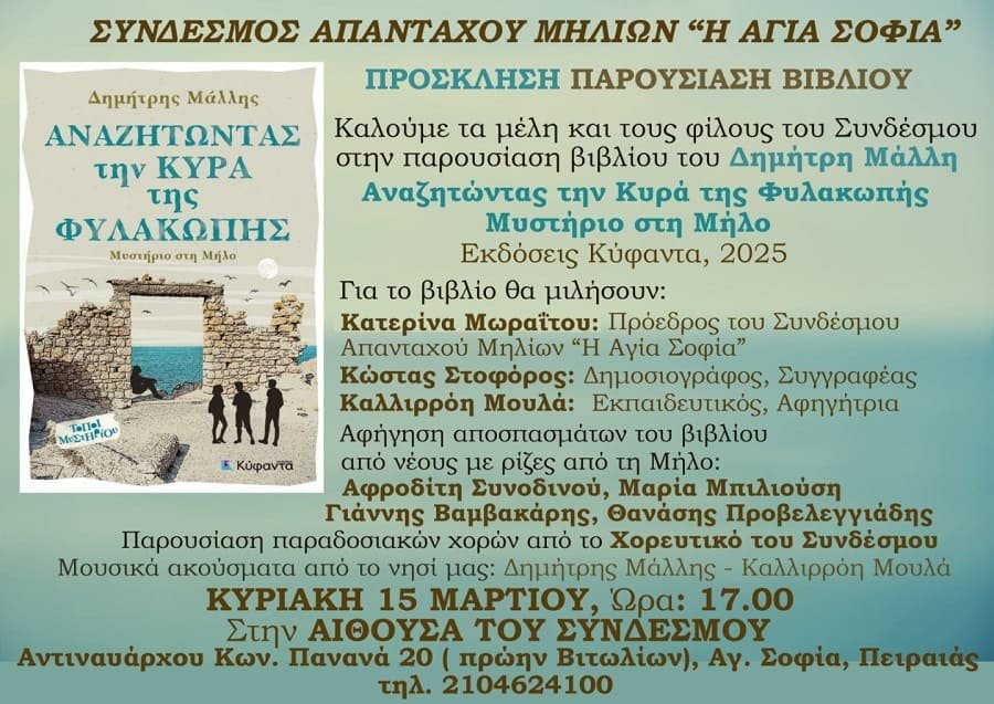 Την παρουσίαση του βιβλίου «Αναζητώντας την Κυρά της Φυλακωπής – Μυστήριο στη Μήλο», του Δημήτρη Μάλλη, διοργανώνει ο Σύνδεσμος των Απανταχού Μηλίων «Η Αγία Σοφία», καλώντας τα μέλη και τους φίλους του σε μια εκδήλωση αφιερωμένη στη μνήμη, την ιστορία και τον πολιτισμό της Μήλου.