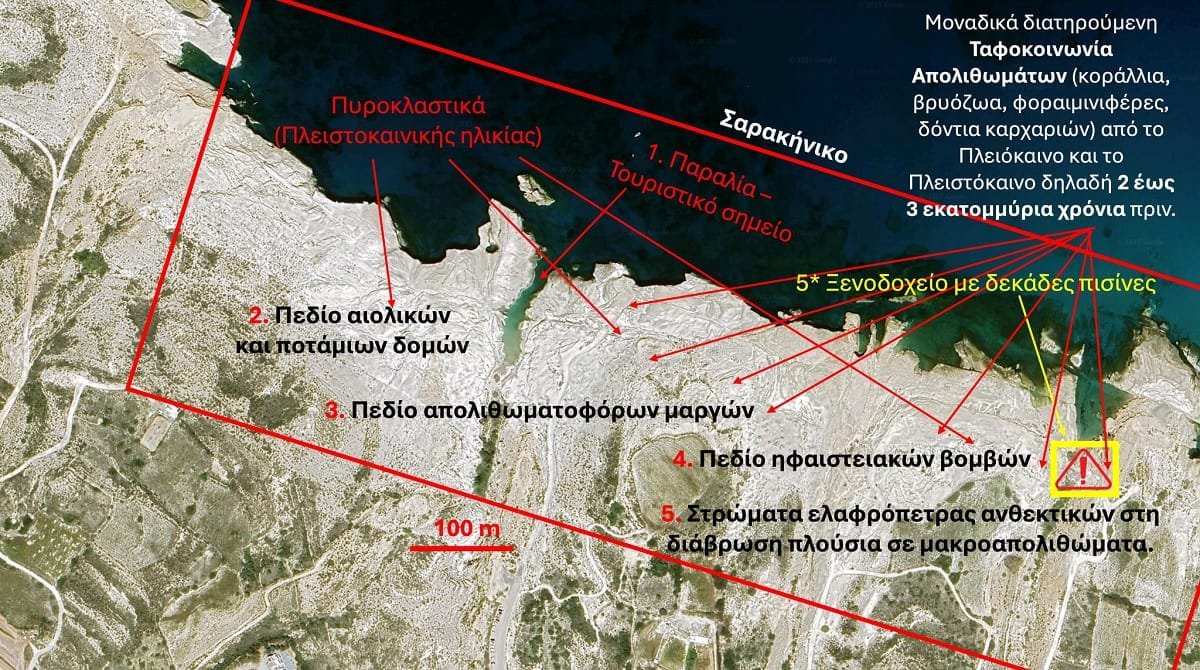 Η ζημιά έχει ήδη γίνει. Τα βαριά μηχανήματα -σκαπτικά, μπουλντόζες, φορτηγά- που πέρασαν πάνω από τα βράχια τσαλαπάτησαν όχι μόνο τα βράχια που αποτελούν από μόνα τους επιστημονικό γεωλογικό αρχείο, αλλά και τα απολιθώματα που διατηρήθηκαν εκατομμύρια χρόνια και ισοπεδώθηκαν εν μια νυκτί ή σκάφτηκαν και πετάχτηκαν στα σκουπίδια με τα μπάζα, ή τσιμεντώθηκαν για να τοποθετηθούν τα θεμέλια του ξενοδοχείου. Στη θέση των απολιθωμάτων, στα σκαμμένα βράχια, έχουν τοποθετηθεί σίδερα, τα οποία μαζί με τα μπετά θα χρησιμοποιηθούν στο χτίσιμο.