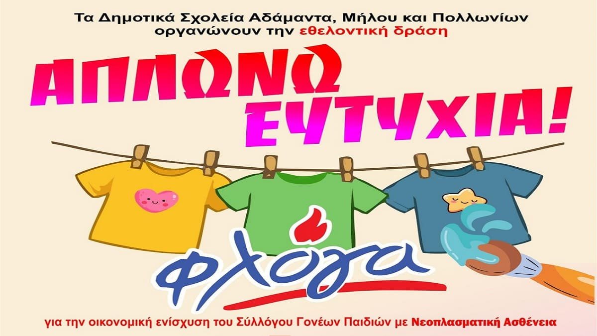 Τα Δημοτικά Σχολεία Αδάμαντα, Μήλου και Πολλωνίων, οργανώνουν την εθελοντική δράση «Απλώνω Ευτυχία». Τα παιδιά θα ζωγραφίσουν μπλουζάκια με θέμα την Ευτυχία και θα τα «απλώσουν» την Παρασκευή 6 Ιουνίου 2025: