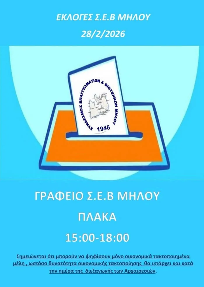 Στη διενέργεια αρχαιρεσιών για την ανάδειξη νέου Διοικητικού Συμβουλίου, αντιπροσώπων Ο.Ε.Σ.Α. και Ελεγκτικής Επιτροπής προχωρά Σύνδεσμος της Μήλου το Σάββατο 28 Φεβρουαρίου 2026, με τη διαδικασία να πραγματοποιείται στην Πλάκα.