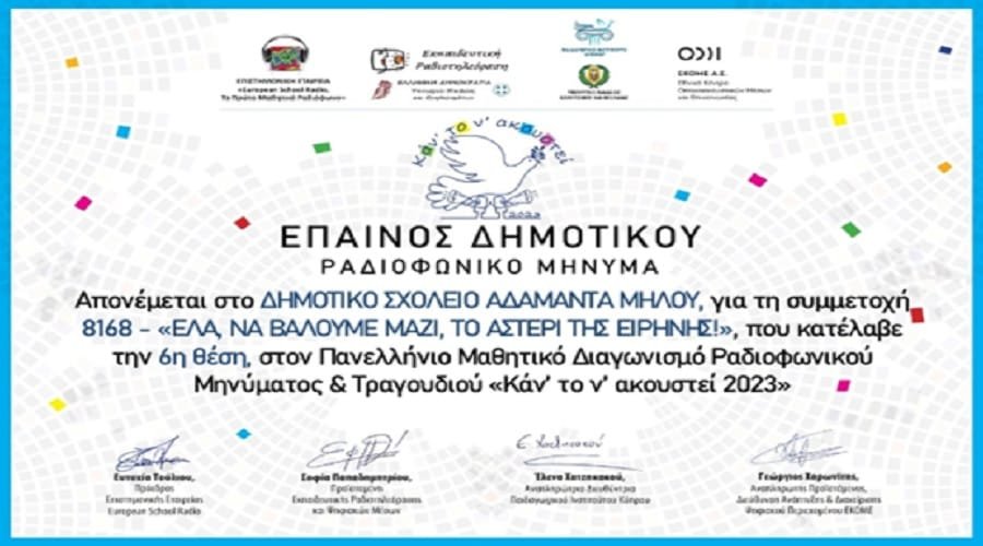 Η Κριτική Επιτροπή του διαγωνισμού, αποτελούμενη από εκπαιδευτικούς, δημοσιογράφους, επικοινωνιολόγους και ραδιοφωνικούς παραγωγούς, απένειμε στους μαθητές και μαθήτριες του Δημοτικού Σχολείου Αδάμαντα Έπαινο για τη συμμετοχή και διάκρισή του στην 6η θέση, ανάμεσα σε 400 περίπου συμμετοχές από Ελλάδα, Κύπρο, Κροατία και Ισπανία!