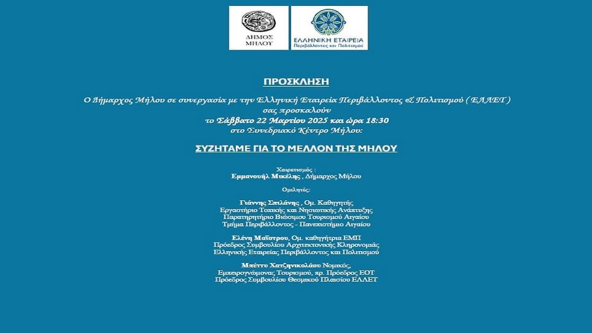 Εν όψει της επικείμενης εκδήλωσης «Συζητάμε για το μέλλον της Μήλου» που διοργανώνει ο Δήμος Μήλου σε συνεργασία με την «Ελληνική Εταιρεία Περιβάλλοντος και Πολιτισμού» (ΕΛΛΕΤ), θα θέλαμε με τη σειρά μας να κάνουμε κάποιες επιπλέον συστάσεις και να τονίσουμε την αναγκαιότητα της καθολικής συμμετοχής.