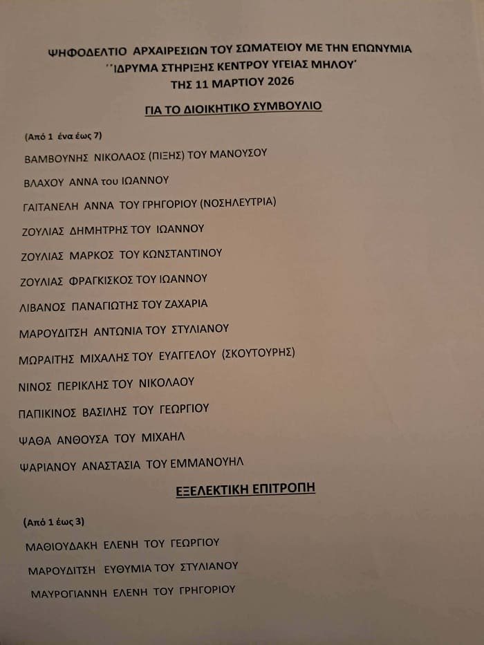 Τον τελικό πίνακα υποψηφίων για τις εκλογές ανάδειξης νέου Διοικητικού Συμβουλίου δημοσιοποίησε το Ίδρυμα Στήριξης Κέντρου Υγείας Μήλου (Ι.Σ.Κ.Υ.Μ.), ενόψει της εκλογικής διαδικασίας που θα πραγματοποιηθεί την Τετάρτη 11 Μαρτίου 2026.