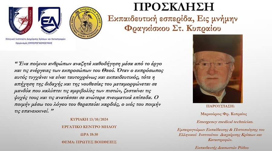 Το Ελληνικό Ινστιτούτο Διαχείρισης Κρίσεων και Καταστροφών και ο Οργανισμός Εμπειρογνωμοσύνης σας προσκαλεί στην εκπαιδευτική εσπερίδα που διοργανώνει στη Μήλο στη μνήμη του Φραγκίσκου Στ. Κυπραίου με θέμα «Πρώτες Βοήθειες»