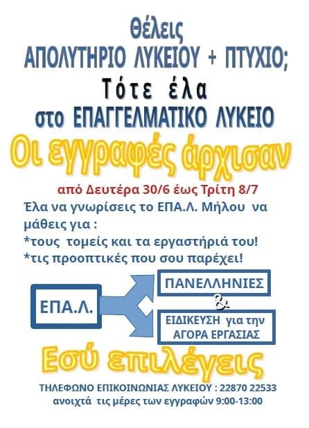 Το ΕΠΑ.Λ. Μήλου ενημερώνει ότι έχουν ξεκινήσει οι εγγραφές και οι ανανεώσεις εγγραφών για το σχολικό έτος 2025-26.