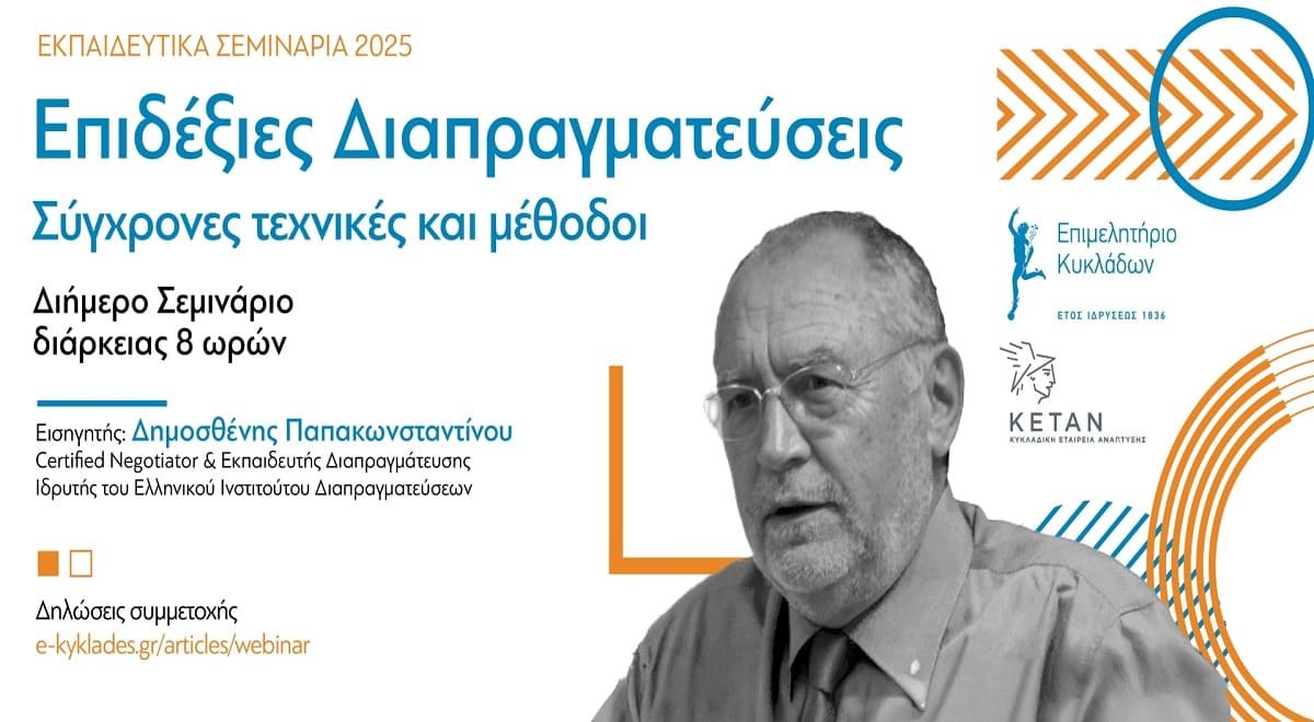 Το Επιμελητήριο Κυκλάδων καλεί κάθε ενδιαφερόμενο να πάρει μέρος στο διήμερο εξειδικευμένο σεμινάριο που διοργανώνει το διάστημα Απριλίου-Μαΐου με θέμα τις σύγχρονες τεχνικές και μεθόδους διαπραγμάτευσης, με εισηγητή τον κ. Δημοσθένη Παπακωνσταντίνου, Certified Negotiator & Certified εκπαιδευτή διαπραγμάτευσης και ιδρυτή του Ελληνικού Ινστιτούτου Διαπραγματεύσεων.