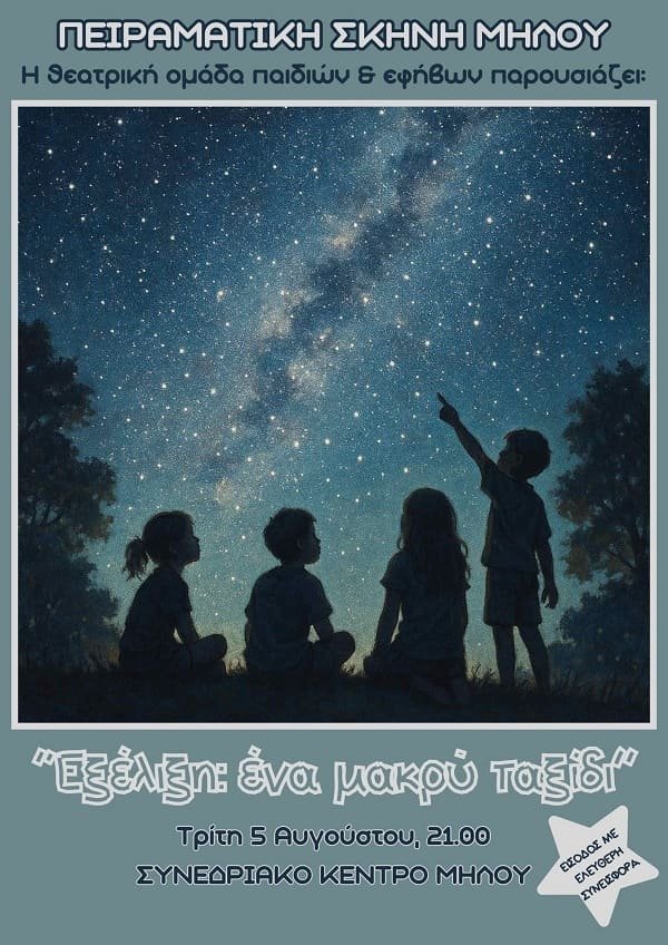 Η Θεατρική Ομάδα Παιδιών & Εφήβων της Πειραματικής Σκηνής Μήλου σας προσκαλεί στη νέα της παράσταση για να θέσουμε μαζί καίρια ερωτήματα κάνοντας μια αναδρομή στο μακρύ ταξίδι από την αυγή του κόσμου μέχρι σήμερα.