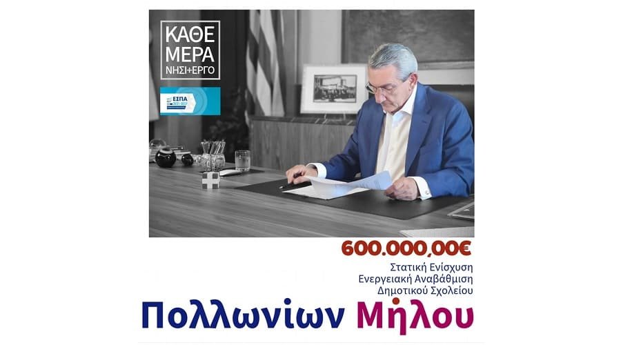 «Στη Μήλο, το έργο που σήμερα βρίσκει τον δρόμο του. Για το Δημοτικό Σχολείο Πολλωνίων της Μήλου, ο Δήμος Μήλου μελέτησε την στατική ενίσχυση και ενεργειακή αναβάθμιση του και κατέθεσε πλήρη πρόταση στην σχετική πρόσκληση που απευθύναμε στους Δήμους των νησιών μας.