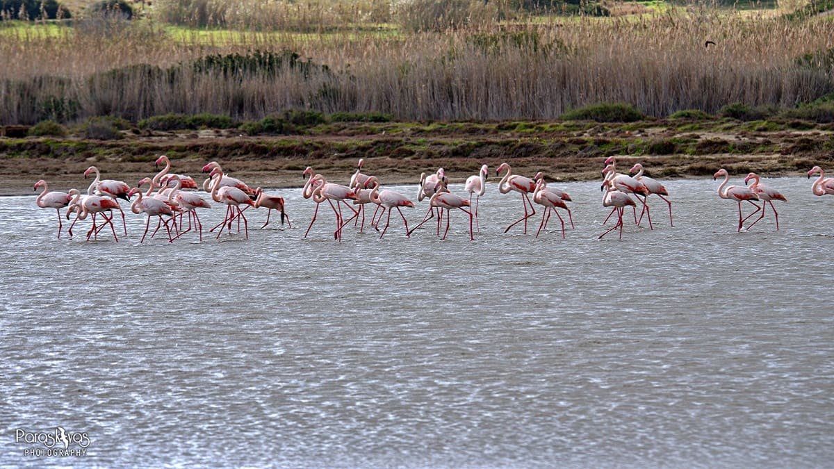 Το θέαμα ήταν πραγματικά μαγευτικό. Τα Φοινικόπτερα κινούνταν αρμονικά μέσα στο νερό, σχηματίζοντας μικρές ομάδες, την ώρα που το πρωινό φως αντανακλούσε στις επιφάνειες της αλυκής, δημιουργώντας εικόνες που έμοιαζαν ζωγραφισμένες.