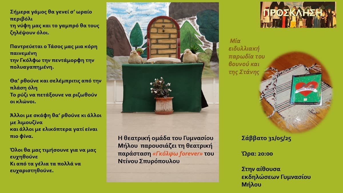 Οι μαθητές του θεατρικού ομίλου Γυμνασίου Μήλου σας προσκαλούν στην θεατρική παράσταση «Γκόλφω forever» του Ντίνου Σπυρόπουλου.