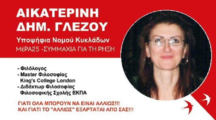 Μια από αυτές τις υποψηφιότητες, είναι η Αικατερίνη Γλέζου, η οποία μάλιστα διαθέτει ένα εντυπωσιακό βιογραφικό. Η κα Αικατερίνη Δημ. Γλέζου, Δρ φιλοσοφίας και Εκπαιδευτικός θα είναι υποψήφια Βουλευτής στο Νομό Κυκλάδων με το ΜέΡΑ25-Συμμαχία για τη Ρήξη.
