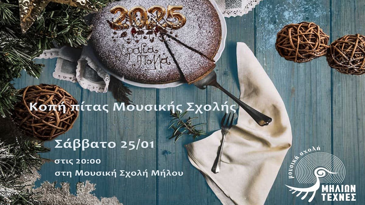 Η Μουσική Σχολή Μήλου – Πολιτιστικός Σύλλογος «Μηλίων Τέχνες» σας προσκαλεί στην κοπή της Πρωτοχρονιάτικης πίτας, το Σάββατο 25 Ιανουαρίου 2025 στις 8.00 το απόγευμα στη Μουσική Σχολή Μήλου στην Πλάκα.
