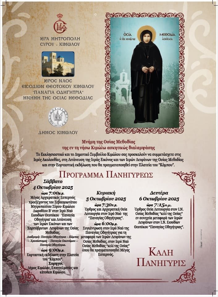 Ο Δήμαρχος Κιμώλου κ. Κωνσταντίνος Εμμ. Βεντούρης και το Δημοτικό Συμβούλιο Κιμώλου σας προσκαλούν να παραστείτε στις Εορταστικές εκδηλώσεις σε μνήμη της εν Κιμώλω ασκησάσης «ΟΣΙΑΣ ΜΕΘΟΔΙΑΣ».