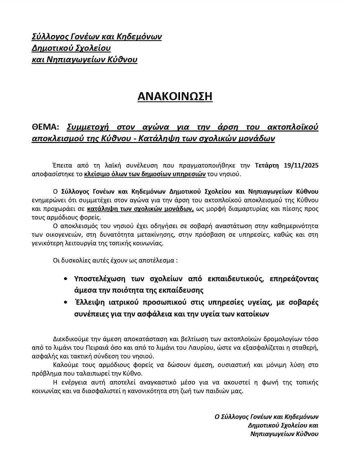 Κατά τη μαζική λαϊκή συνέλευση της Τετάρτης 19 Νοεμβρίου, γονείς, εκπαιδευτικοί και κάτοικοι αποφάσισαν την προσωρινή αναστολή λειτουργίας όλων των δημόσιων υπηρεσιών και την κατάληψη των σχολικών μονάδων. Στόχος τους είναι η άμεση εξεύρεση λύσης στο ακτοπλοϊκό πρόβλημα, το οποίο επηρεάζει καίριους τομείς όπως η εκπαίδευση, η υγεία και οι μετακινήσεις.