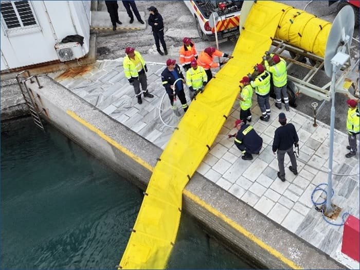 Κατόπιν ολοκλήρωσης της διαδικασίας της αγκυροβόλησης, τοποθετήθηκαν στις άκρες του τα απαραίτητα απορροφητικά υλικά, έτσι ώστε να αποφευχθεί η διαφυγή των διαρρεόντων ρύπων από τα κενά τα οποία πάντα υπάρχουν μεταξύ των απολήξεων των φραγμάτων και των κρηπιδωμάτων, ενώ παράλληλα ενεργοποιήθηκε η συσκευή Skimmer.