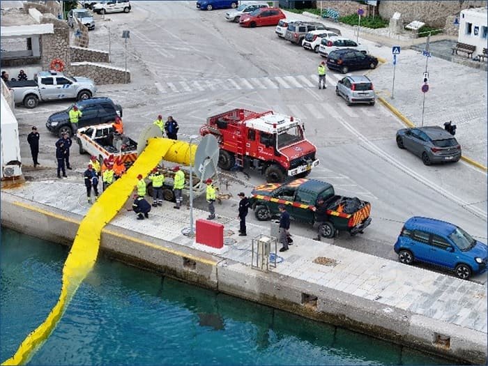 Για τον εγκλωβισμό της υποτιθέμενης ρύπανσης μεταφέρθηκε με όχημα 4 Χ 4 στο χώρο του συμβάντος μία τροχήλατη ανέμη της IMERYS S.A. (αντίστοιχη με αυτή που διαθέτει το ΔΛΤ Μήλου), επί της οποίας υπάρχουν Επιχειρησιακά τοποθετημένα και συνδεδεμένα 180 μέτρα Πλωτά Φράγματα ανοικτής Θαλάσσης τύπου SCORPION 1150, ενώ μία άλλη Ομάδα μετέφερε από τον εξοπλισμό του ΔΛΤ Μήλου όλα τα απαραίτητα αγκυροβόλια, αλλά και τα απορροφητικά υλικά που κρίθηκε ότι θα χρειαστούν, από αυτά που βρίσκονται Επιχειρησιακά τακτοποιημένα εντός Container στον Λιμένα της Κάναβας.