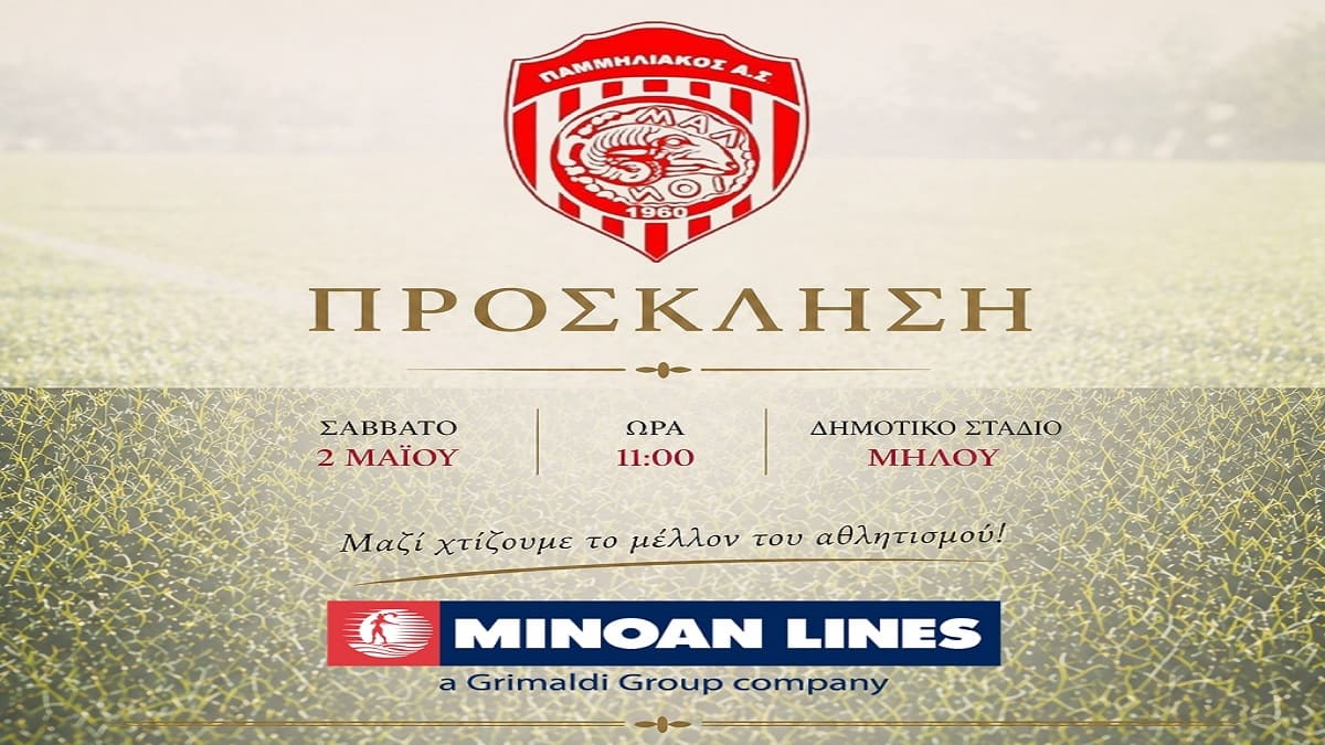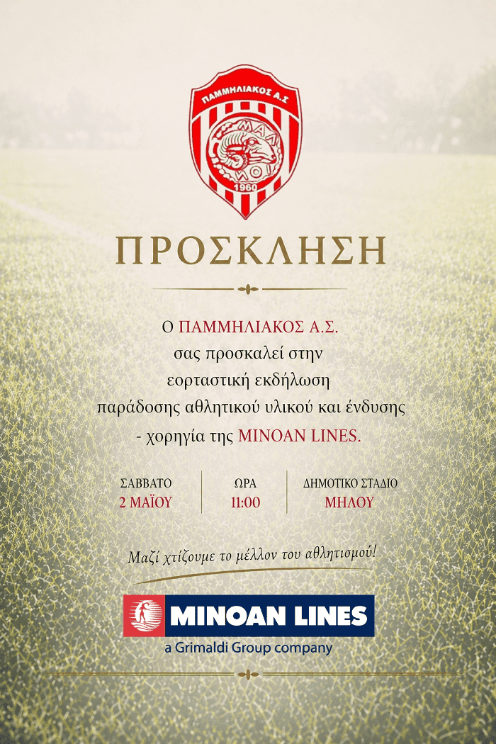 Σε μια ιδιαίτερα σημαντική πρωτοβουλία για τον τοπικό αθλητισμό, η MINOAN LINES στηρίζει έμπρακτα τον Παμμηλιακό Αθλητικό Σύλλογο, προσφέροντας αθλητικό υλικό και ένδυση, σε μια εκδήλωση που θα πραγματοποιηθεί το Σάββατο 2 Μαΐου 2026 στις 11:00 το πρωί στο Δημοτικό Στάδιο Μήλου.
