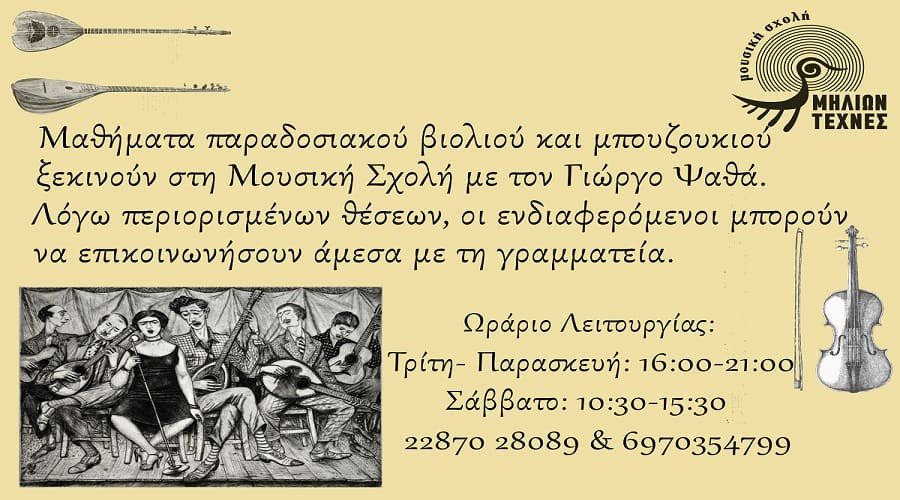 Η Μουσική Σχολή Μήλου Πολιτιστικός Σύλλογος «Μηλίων Τέχνες» ανακοινώνει ότι θα ξεκινούν μαθήματα παραδοσιακού βιολιού και μπουζουκιού με τον Γιώργο Ψαθά.