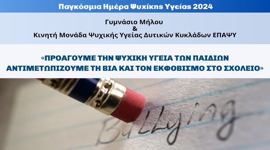 Το Γυμνάσιο Μήλου και η Κινητή Μονάδα Ψυχικής Υγείας Δυτικών Κυκλάδων ΕΠΑΨΥ διοργανώνουν δράση για την Παγκόσμια Ημέρα Ψυχικής Υγείας 2024 με τίτλο «Προάγουμε την Ψυχική Υγεία των παιδιών αντιμετωπίζουμε τη βία και τον εκφοβισμό στο σχολείο».