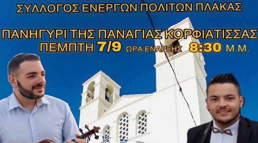 Ο Σύλλογος Ενεργών Πολιτών Πλάκας σας προσκαλεί την Πέμπτη 7 Σεπτεμβρίου στο πανηγύρι για τον Εορτασμό της Παναγίας Κορφιάτισσας.