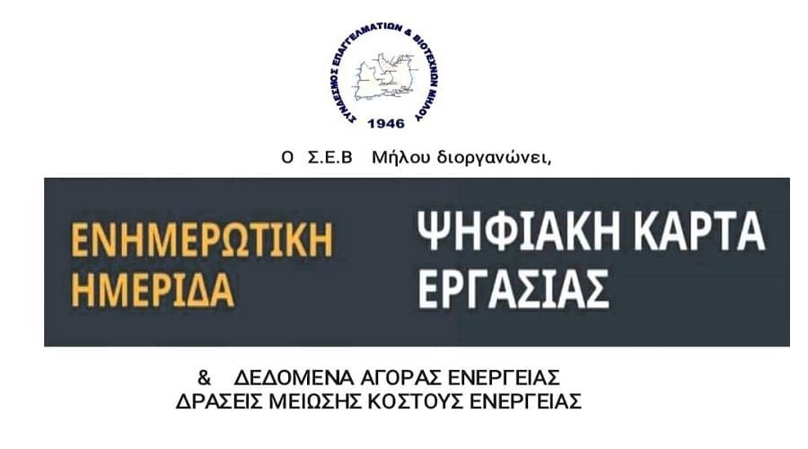 Ο Σύνδεσμος Επαγγελματιών Μήλου, στα πλαίσια ενημέρωσης των μελών του, αλλά και όλων των επιχειρήσεων του νησιού μας, διοργανώνει ημερίδα σχετικά με την ΨΗΦΙΑΚΗ ΚΑΡΤΑ ΕΡΓΑΣΙΑΣ και την εφαρμογή της στην καθημερινότητα και τα Δεδομένα Αγοράς Ενέργειας και Δράσεις Μείωσης Κόστους Ενέργειας.