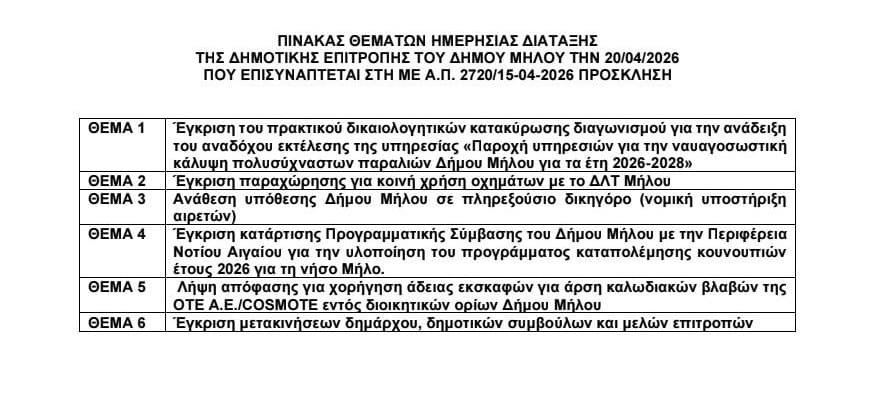 Συνεδρίαση της Δημοτικής Επιτροπής Μήλου θα πραγματοποιηθεί την Δευτέρα 20 Απριλίου 2026 στις 09:00, με τη συμμετοχή μελών δια ζώσης και μέσω τηλεδιάσκεψης, για τη συζήτηση έξι (6) θεμάτων ημερήσιας διάταξης.