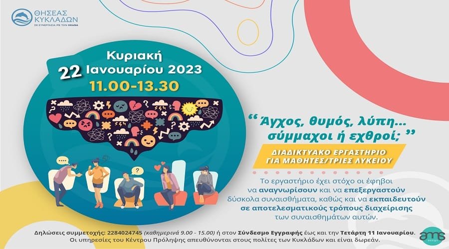 Το εργαστήριο του Ιανουαρίου έχει τίτλο «Άγχος, θυμός, λύπη… σύμμαχοι ή εχθροί;» και στόχο την αναγνώριση και την επεξεργασία δύσκολων συναισθημάτων και την εξοικείωση με αποτελεσματικούς τρόπους διαχείρισής τους, μέσα από ατομικές και ομαδικές ασκήσεις, συζήτηση και δημιουργική αλληλεπίδραση όλων των συμμετεχόντων. Θα πραγματοποιηθεί την Κυριακή 22 Ιανουαρίου 2023, 11:00-13:30.