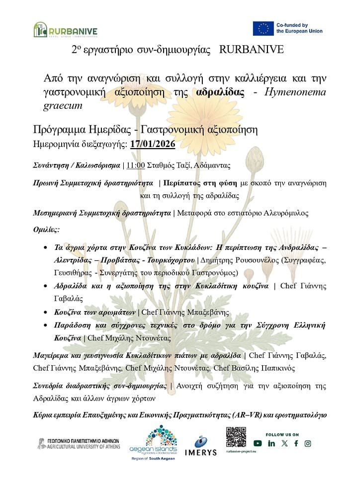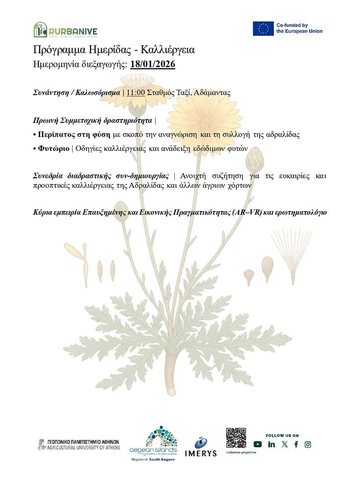 Δύο ημερίδες αφιερωμένες στη βρώσιμη άγρια αδραλίδα και στον πλούτο της κυκλαδίτικης φύσης θα πραγματοποιηθούν στη Μήλο στις 17 και 18 Ιανουαρίου 2026, στο πλαίσιο του ευρωπαϊκού προγράμματος RURBANIVE.