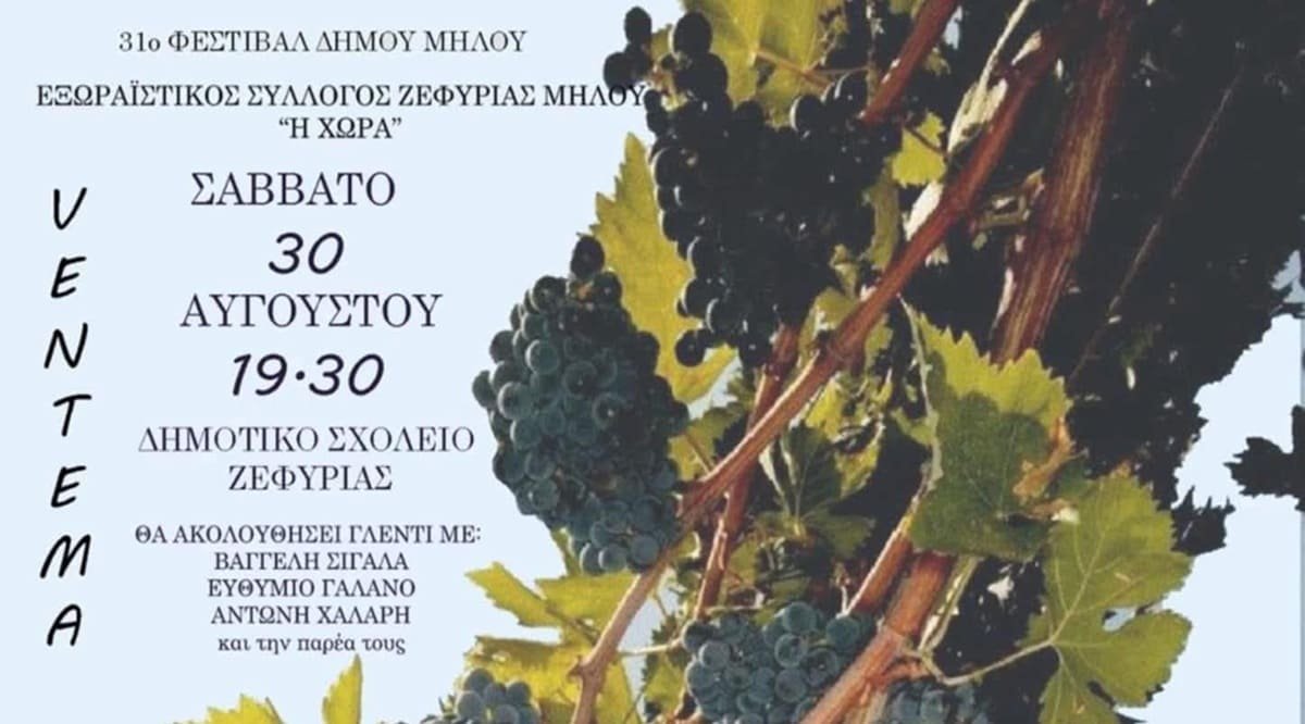 Ο Εξωραϊστικός και Πολιτιστικός Σύλλογος Ζεφυρίας Μήλου «Η Χώρα» σας προσκαλεί στη «ΒΕΝΤΕΜΑ 2025», το Σάββατο 30 Αυγούστου στις 19.30 στο Δημοτικό Σχολείο Ζεφυρίας.